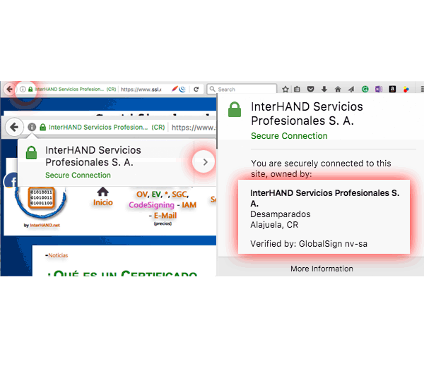 Confirmarle a sus visitantes y clientes que están en el sitio correcto, ya que el certificado SSL EV desplegará el nombre registral de su entidad y dentro del certificado, el cliente podrá validar la dirección y otros detalles relevantes de su empresa.